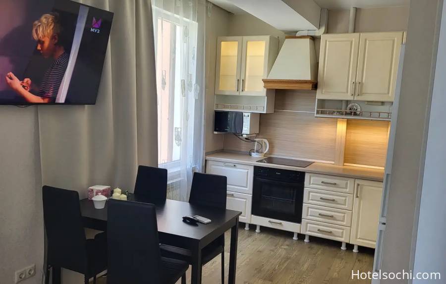 Планировка продумана для удобства: отдельная спальня и большая кухня-гостиная, где комфортно разместится семья или компания до 5 человек. До моря - около 600 метров. Дорога проходит вдоль ухоженной набережной реки Псахе и занимает не более 10 минут спокойным шагом.